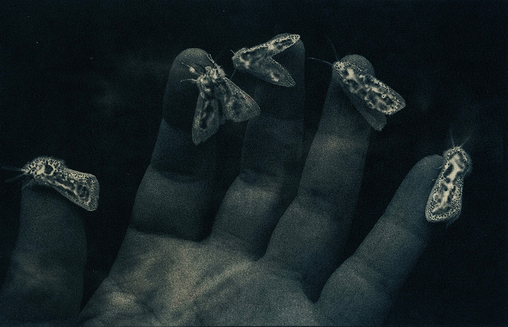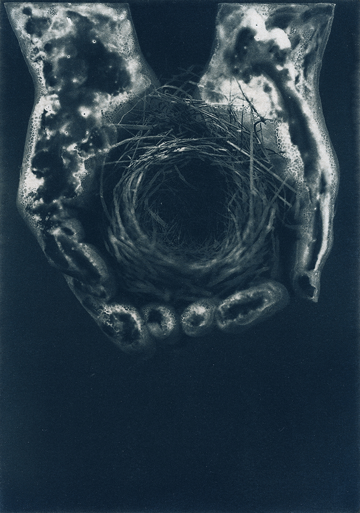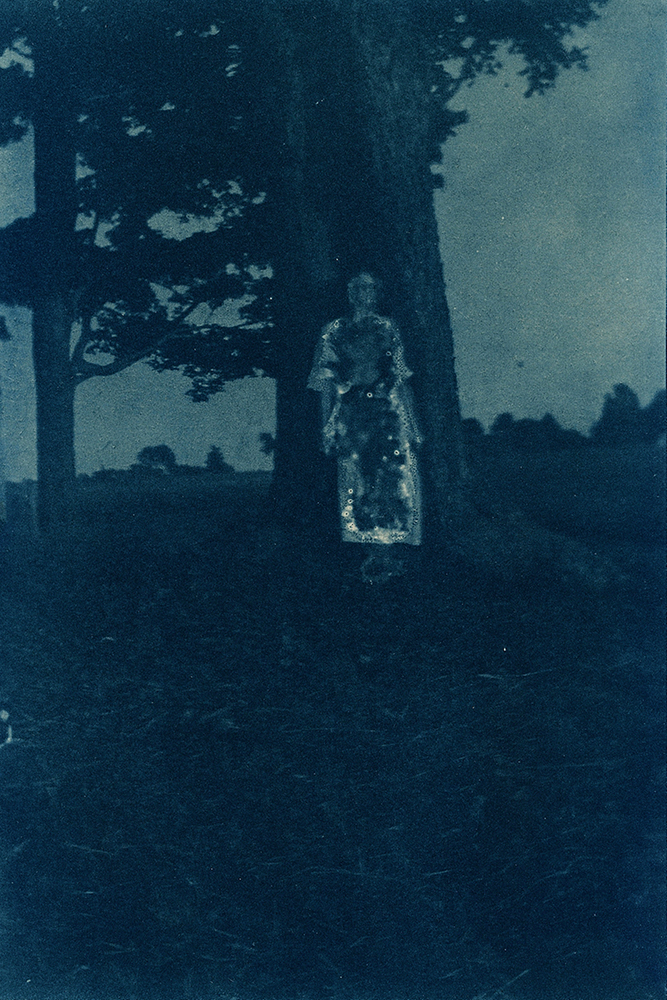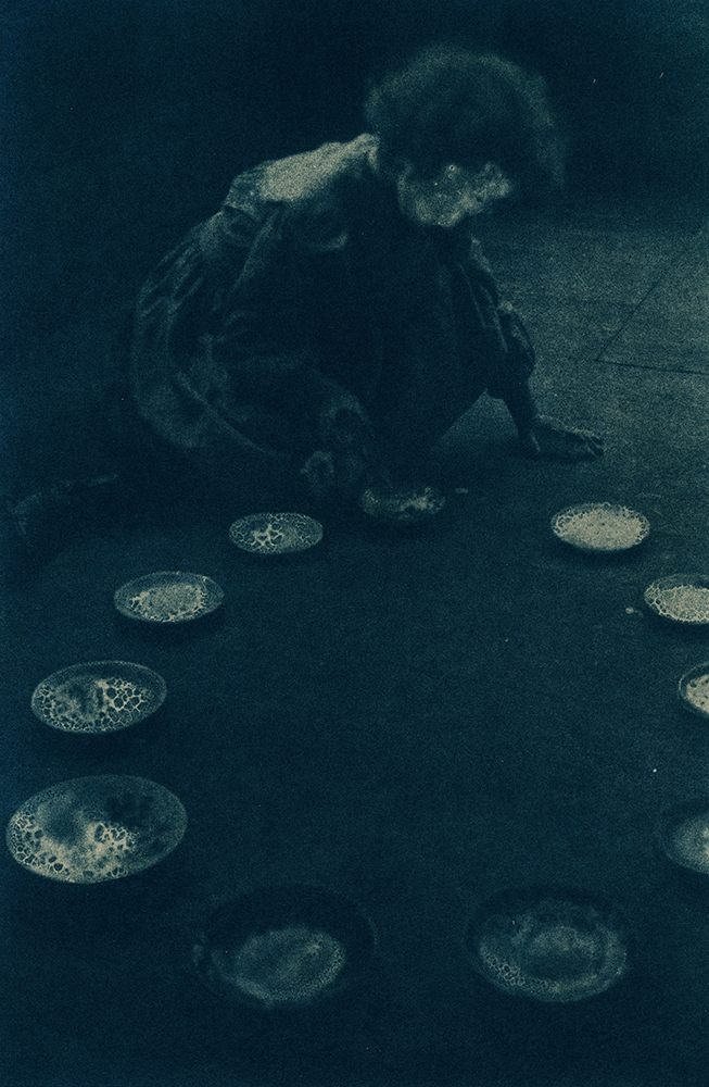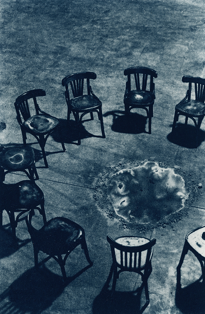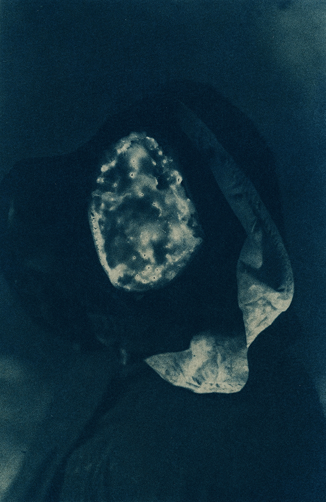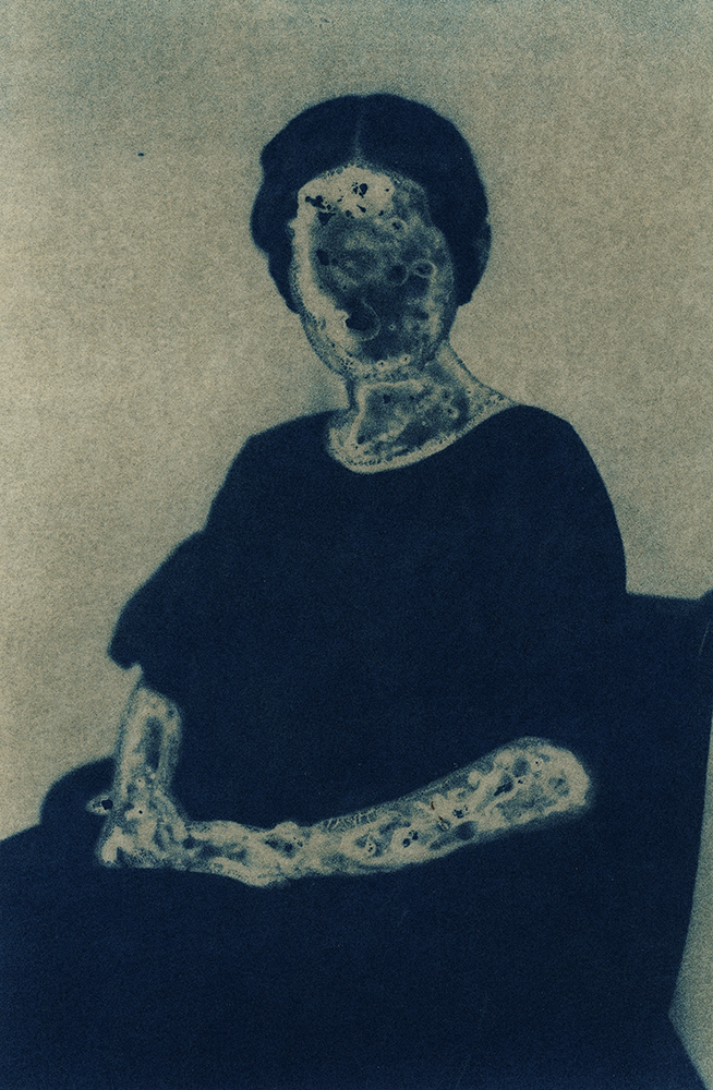 Toda essa falta moveu a criação de imagens em que eu pudesse guardar Thereza, em que pudesse me encontrar com ela e em que seu nome regressasse aos olhos e às bocas. Cheguei à cianotipia por todo o contato que a técnica convoca. O contato material entre os suportes sensíveis e a luz, claro, e também o contato de meu corpo e todos os meus sentidos.