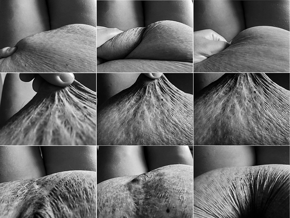 Fotografia digital em dimensões variadas . 2 fotografias para esse formulário mas a série contem outras imagens. Esse trabalho é resultado de um processo auto investigativo através da fotografia com autoretratos que começam durante o primeiro puerpério. Um reencontro com o corpo estranho que agora "vazio" parece perder o seu lugar. É mole, rugoso, grande, é molhado esse corpo. Cheira diferente, se encolhe, se contorce, alimenta. Um corpo forte o meu corpo. Então me fotografo, exaustivamente, para me lembrar do que ele é possível./As duas fotografias quando expostas sempre causam reações diversas. As pessoas não reconhecem a barriga na foto 2, acham ser o seio, desistem de olhar as estrias, as texturas,é perceptível que a imagem incomoda.